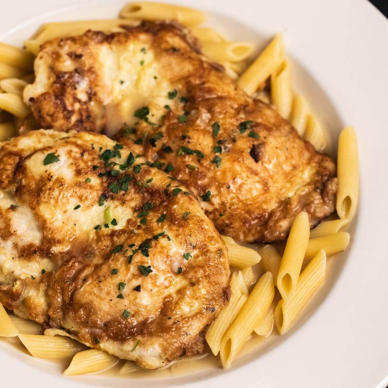 Served with onions, mushrooms, capers & tomatoes in a pink pesto cream sauce.