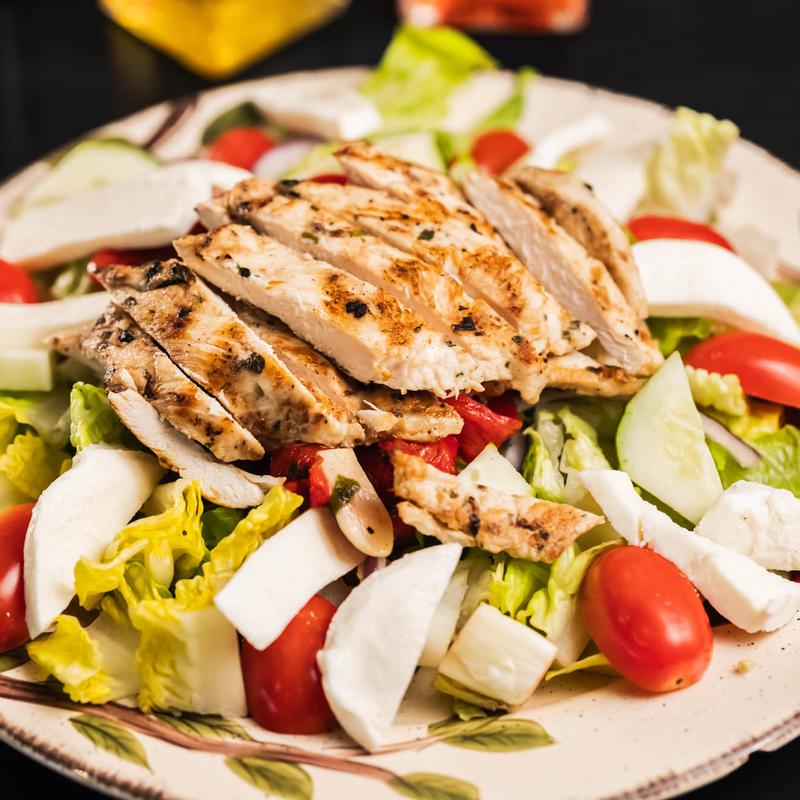 Seasoned grilled chicken strips, with fresh mozzarella, roasted peppers & balsamic dressing.